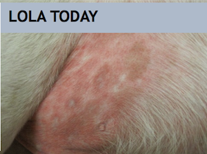 Within an hour of receiving an epinephrine injection and beginning IV fluids with dextrose, Lola’s blood perfusion began to improve. Her mucous membranes returned to a healthy pink and her CRT was less than two seconds. Uticaria, or hives, began to develop on her skin, confirming her diagnosis of anaphylactic shock. These skin markings are generated by an inflammatory response to the toxin in which the release of histamine and other substances cause fluid to accumulate under the skin.