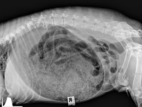 On physical exam Poppy had a distended, painful cranial abdomen. The rest of her exam was unremarkable, but she did have a slight fever at 103.1 degrees. A diagnostic plan was discussed with the owner and it was decided to do radiographs to see the severity of the issue.
