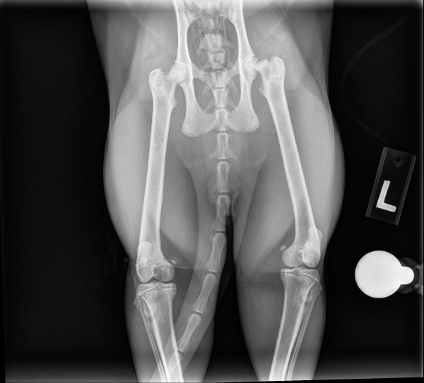 Radiographs of the pelvis and left femur were performed and reviewed by the IVS on staff veterinarian (Dr. Blong) and an IDEXX board-certified radiologist. Imaging revealed a complete, transverse Salter-Harris type I fracture of the left femoral head physis along with delayed physeal closure. This indicated that the fracture occurred at the growth plate and caused a slipped epiphysis.