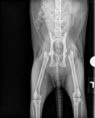 Treatment options for femoral head fractures, whether spontaneous or secondary to suspected metaphyseal osteopathy, vary depending on the severity and chronicity of the lesion. One surgical approach is open reduction and internal fixation using Kirschner wires (K-wires), which aims to preserve the native anatomy and function of the coxofemoral joint. Outcomes for this technique are generally favorable, with most cats achieving good to excellent functional recovery. Alternatively, a femoral head ostectomy (FHO procedure) may be performed. This procedure involves removing the head of the femur, allowing the surrounding muscles to hold the femur in place. This creates a false joint but allows free mobility of the coxofemoral joint without the typical ball-and-socket joint. While this procedure is also associated with good to excellent outcomes, in many cases potential complications include persistent lameness, limb shortening, reduced range of motion, or discomfort upon manipulation of the joint.