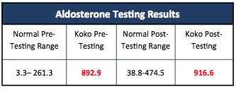 Hyperaldosteronism. This condition is very rare in cats and often underdiagnosed. The elevated aldosterone levels confirmed this diagnosis when testing adrenal gland function. It is commonly associated with a tumor of the adrenal gland(s) which causes over -production of aldosterone and the subsequent symptoms seen in Koko.